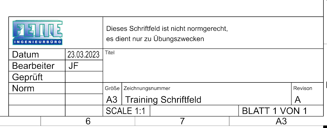 Wir erstellen mit Ihnen Ihr neues Schriftfeld in einer 1-tägigen Schulung. Dazu gibt es eine umfangreiche Schulungsunterlage s. hier.